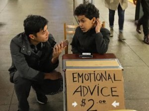New York Post gazetesinin haberine göre Ciro Ortiz ismindeki 6. sınıf öğrencisi Brooklyn'de Bedford L metrosu durağında açtığı tezgahında yetişkinlere "duygusal tavsiye" veriyor.