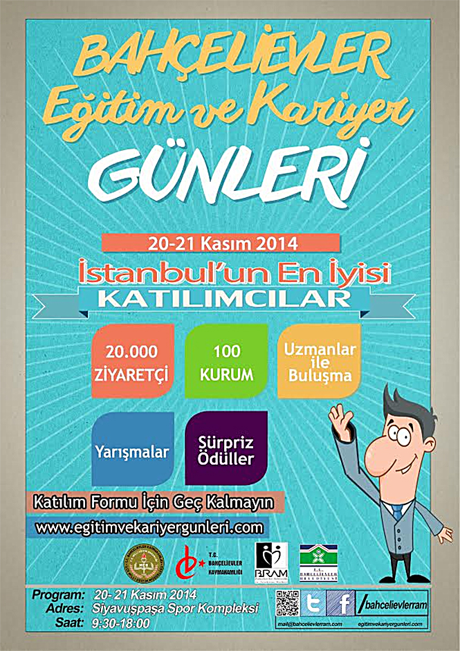 Ülkemizin aydınlık geleceğinde söz sahibi olacak gençlerimizin sağlıklı kariyer planlaması yapabilmesine katkı sağlamaya büyük önem veren Bahçelievler Kaymakamlığı’na bağlı Rehberlik ve Araştırma Merkezi tarafından organizasyon çalışmaları yürütülen ‘’Eğitim Ve Kariyer Günleri ‘’20.10.2014 -21.10.2014 tarihleri arasında Bahçelievler Siyavuşpaşa Spor Kompleksinde gerçekleştirilecektir. Etkinliğimizde İŞKUR , yurtiçi ve yurt dışında , devlet-vakıf üniversitelerinden, eğitim danışmanlık kurumlarından, sanat akademilerinden, ve STK’lardan 50 kurumun 150 stant görevlisi yer alacaktır.