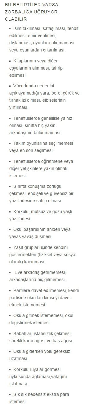 Örnekleri çoğaltmak mümkün. Okullarda sık karşılaşılan sorunlardan biri akran zorbalığı. Yani çocukların birbirini üzmek, korkutmak için yaptığı sürekli ve kasıtlı olan davranışlar. Zorbalığın üç türü var. Bir kişi hakkında dedikodu yapma, onu konuşmalardan, oyunlardan dışlama yani psikolojik ve duygusal zorbalık. İsim takma, tehdit etme gibi davranışların yapıldığı sözel zorbalık ve itme, vurma gibi fiziksel zorbalık türleri var.