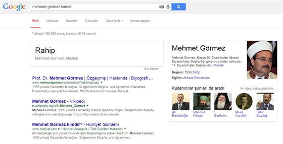 Buna göre arayacağınız kişinin ismini yazıp sonuna “kimdir” diye eklediğiniz de, o ismin mesleği çıkıyor. Aynı aramayı Diyanet İşleri Başkanı Prof. Dr. Mehmet Görmez için yapıldığında ise, "Mesleği: Rahip” sonucunu veriyor.