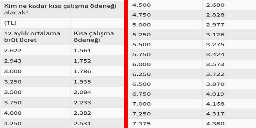 Brüt ücret tutarına göre kimin ne kadar kısa çalışma ödeneği alabileceği, aşağıdaki tabloda yer alıyor.