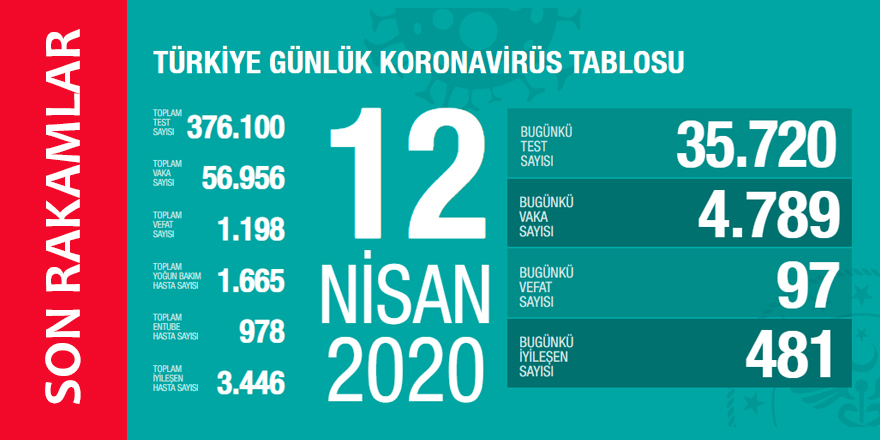 Toplam test sayısı 376 bin 100, toplam vaka sayısı 56 bin 956, toplam vefat sayısı 1198, toplam yoğun bakım hasta sayısı 1665, toplam entübe hasta sayısı 978, toplam iyileşen hasta sayısı 3 bin 446 oldu.