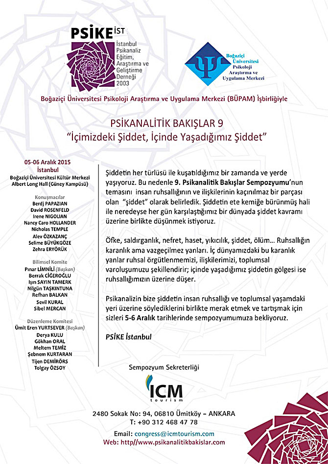 PSİKANALİTİK BAKIŞLAR 9: "İçimizdeki Şiddet, İçinde Yaşadığımız Şiddet" (2015) konulu sempozyum 5-6 Aralık 2015 tarihlerinde yapılacak. Ayrıntılı bilgi için tıklayınız...