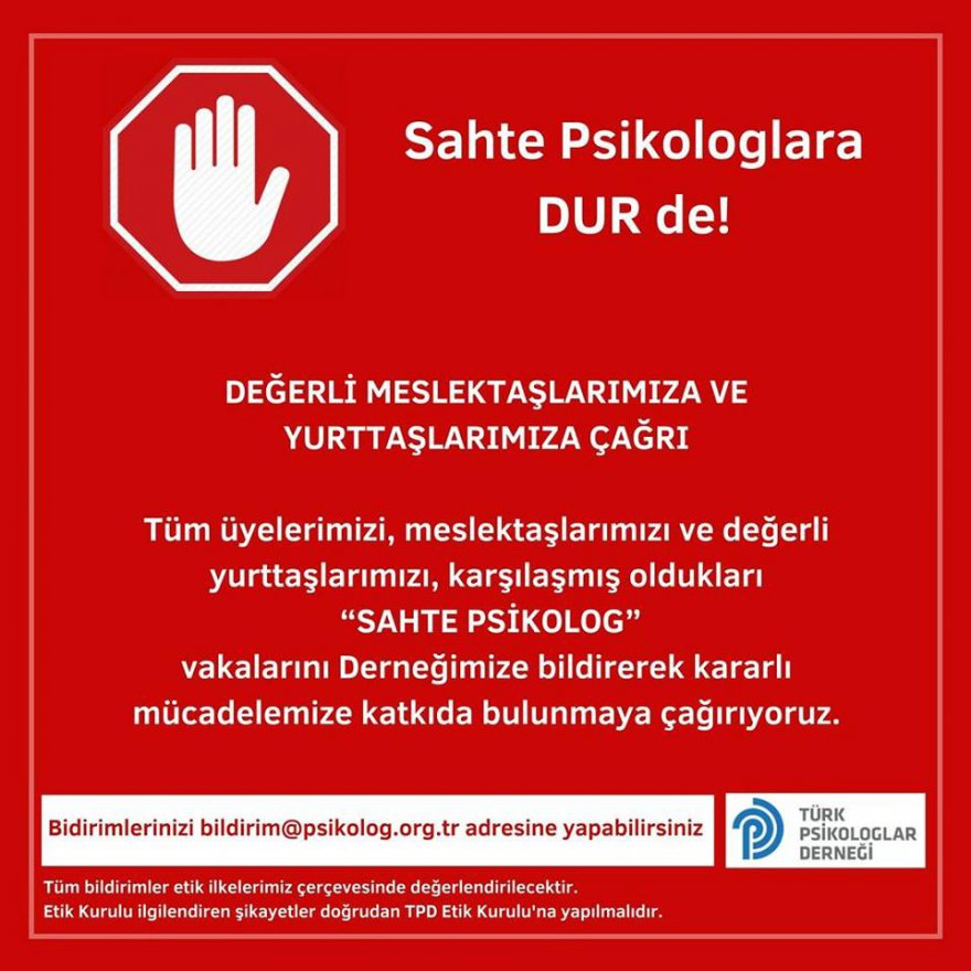 Tam da bu nedenle tüm üyelerimizi, meslektaşlarımızı ve değerli yurttaşlarımızı, karşılaşmış oldukları “sahte psikolog vakalarını” derneğimize bildirerek kararlı mücadelemize katkıda bulunmaya çağırıyoruz.