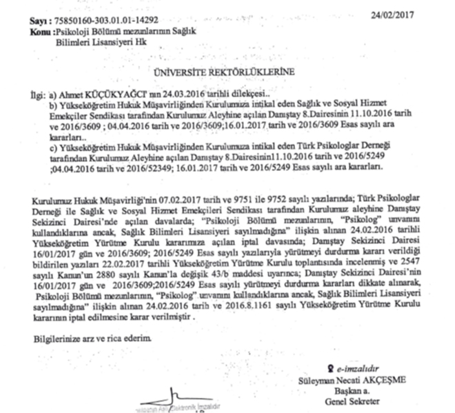 Türk Psikologlar Derneği ile Sağlık ve Sosyal Hizmet Emekçileri Sendikası tarafından YÖK aleyhine Danıştay Sekizince Dairesinde açılan iptal davasında; "Psikoloji" mezunlarının "Psikolog" unvanını kullandıklarını ancak, Sağlık Bilimi Lisansiyeri sayılmadığına ilişkin Yükseköğretim Yürütme Kurulu Kararı hakkında Danıştay tarafından yürütme durdurma kararı verilmiştir.